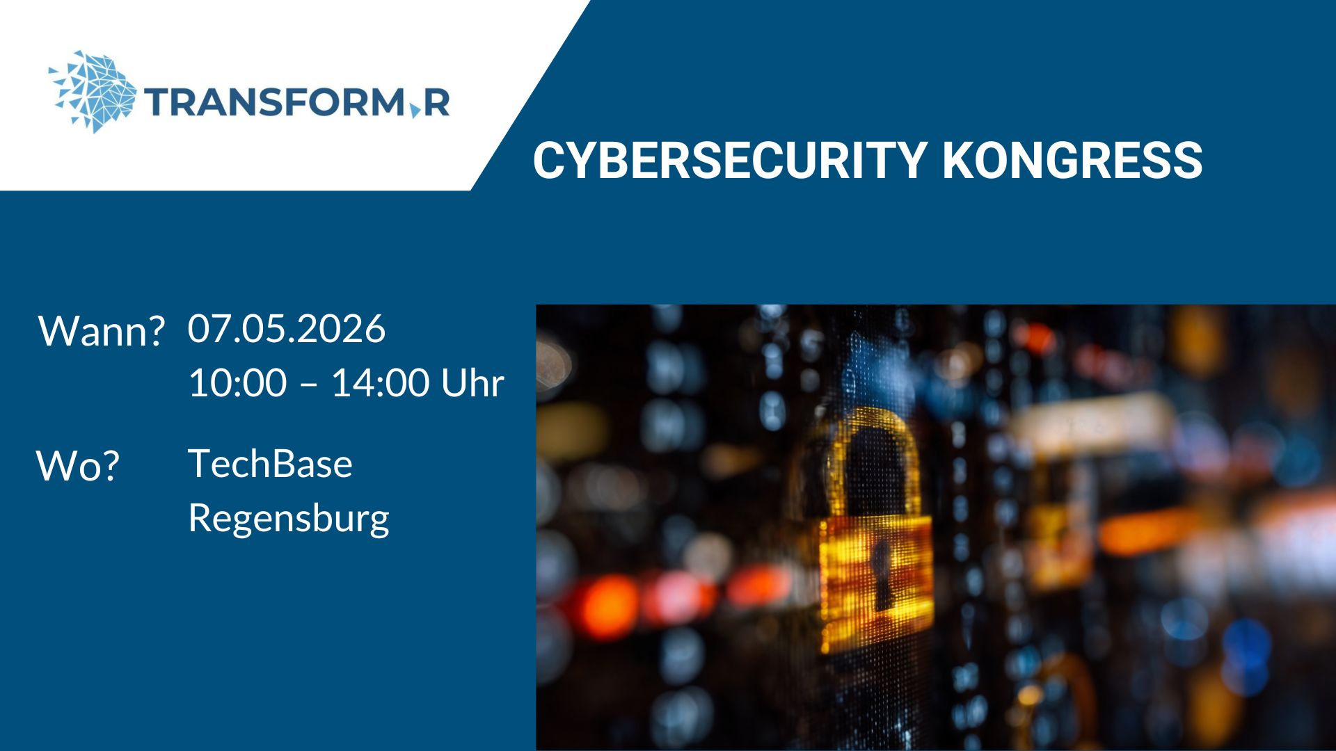 Das Transformationsnetzwerk transform.r lädt Sie am 07. Mai 2026 herzlich ein zum Cybersecurity Kongress in der TechBase in Regensburg.
